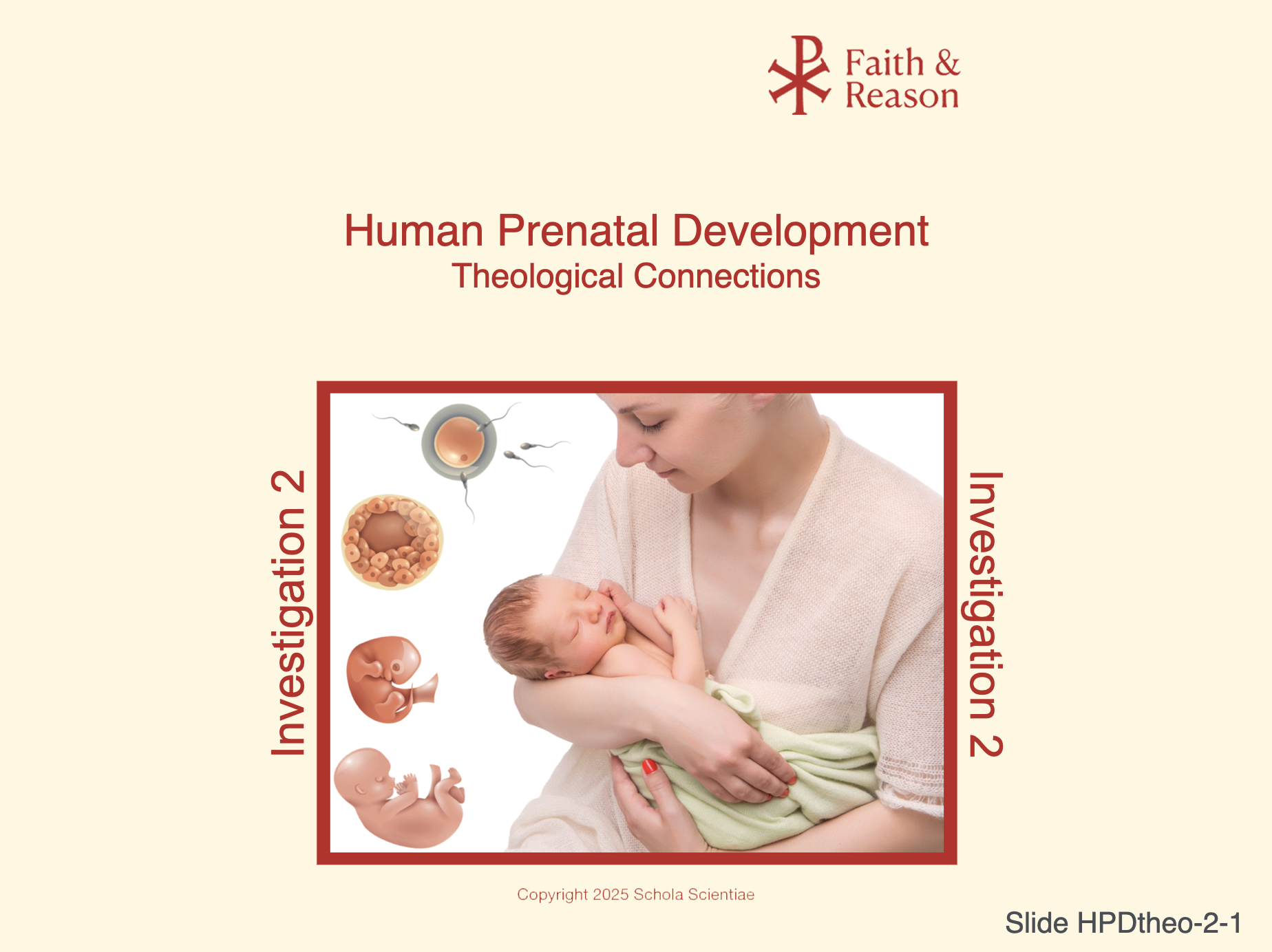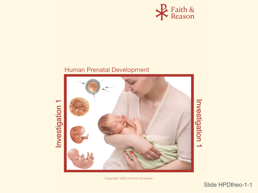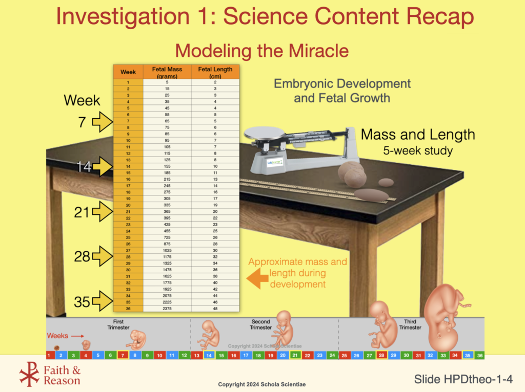 This slide shows a part of the lab for Investigation 1 in which the developmwnt of a human, from conception to birth, occurs. Point out how scientific measurement of fetal development reveals the miracle of life. Suggest that data (mass, length) is not just technical—it’s evidence of God’s unfolding plan. Invite wonder at the order and beauty of development.
