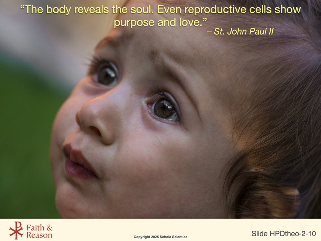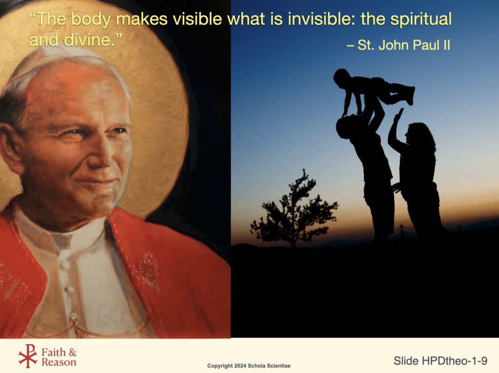 Explain how TOB teaches that the human body is not just biological—it’s theological. Invite reflection: ‘How does your body show who you are inside—your soul, your love, your dignity?’