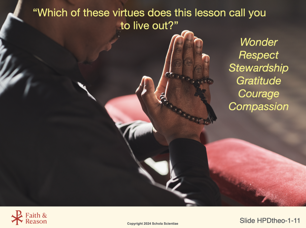 Read each virtue aloud. Invite students to choose two and write how understanding human development helps them live these out. This is a great point for small group sharing or journaling.