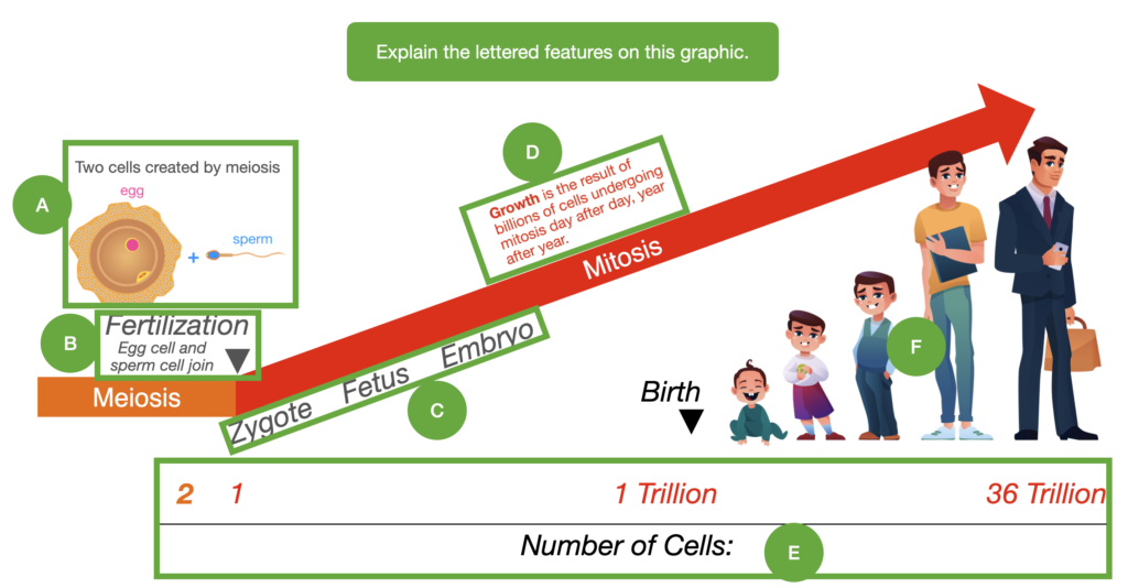 1. The graphic below summarizes the entire process you explored in this Investigation, from meiosis through human growth. Each letter (A–F) highlights a key feature of the process.