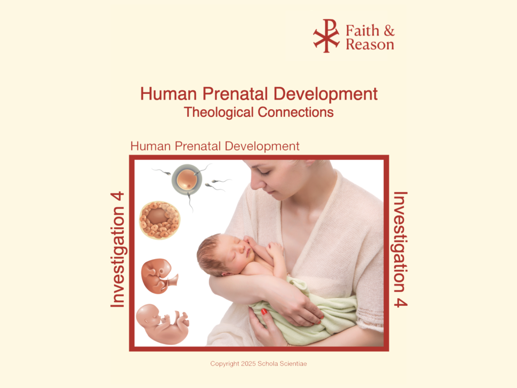 This introductory slide sets the tone for the Human Prenatal Development Investigation 4 Theology lesson. It visually connects the scientific journey from fertilization to birth with the theological theme of God’s design and love for human life at every stage.